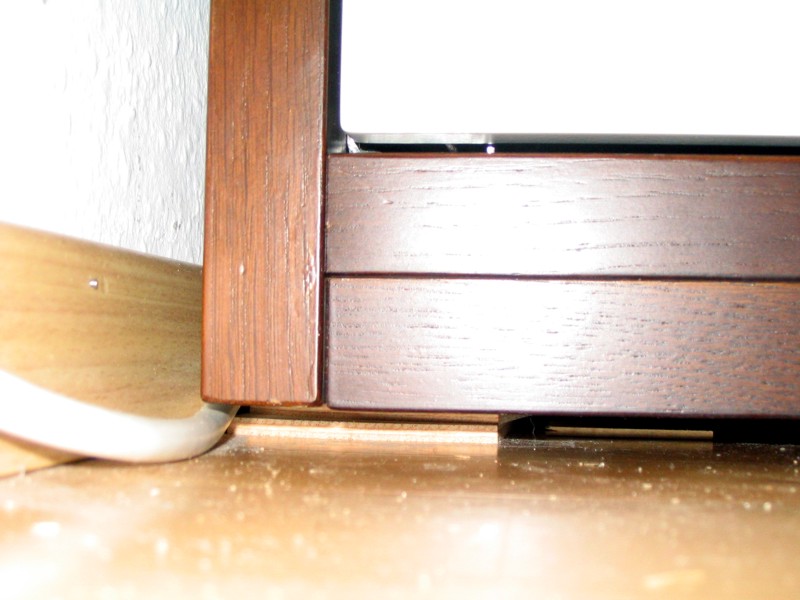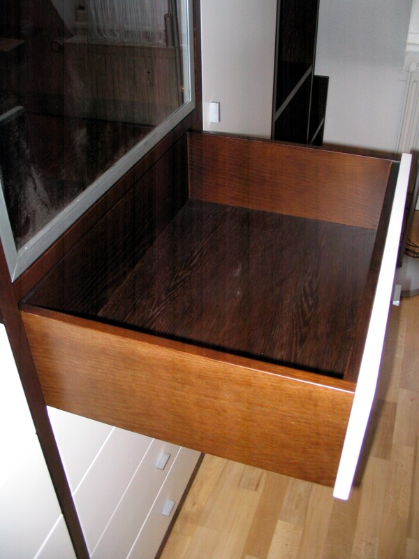„Das ist aber ne Menge Holz!“ sagten die Handwerker, als sie die zentimetertiefe Delle im Fußboden sahen, die sie durch Unterlegkeile ausgleichen mussten. Nachdem das aber erstmal geschafft war, ging der restliche Aufbau ziemlich fix. Überhaupt waren die Jungs von der fixen Sorte – sie sollten um 10 Uhr da sein, tatsächlich klingelte es bereits 9:55 Uhr. Gegen 12:25 Uhr standen dann sämtliche Teile, waren die drei Türen angeschraubt und die 10 Schubladen (mit selbsteinziehendem Vollauszug) eingesetzt, ein Loch in die Rückwand gebohrt (wegen des Lautsprecherkabels).