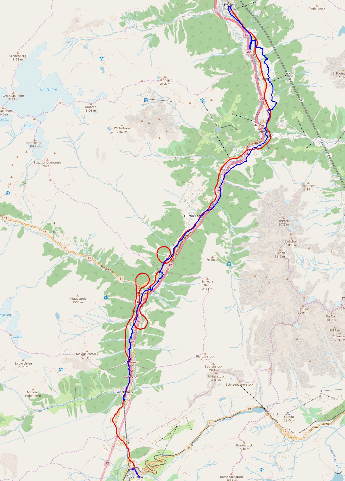 • Wegführung der Wanderstrecke zwischen Amsteg und Erstfeld – ein ständiges unnötiges auf und ab am Berghang, wo man schön unten am Ufer der Reuss geradeaus latschen könnte