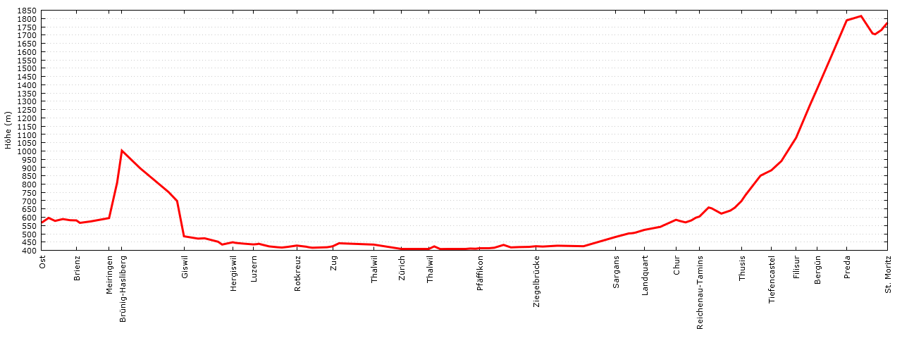 Irgendwann muss ich mir auch mal noch die Altstadt von Chur ansehen, bisher bin ich da immer nur umgestiegen und habe damit von der ältesten Stadt der Schweiz außer dem recht jungen Bahnhof quasi nix gesehen, woran sich auch an diesem Tage nichts änderte. Dafür saß ich nun mit einem älteren Schweizer Ehepaar samt großem Vierbeiner im Abteil, wobei der Hund aber mehr am Schlafen interessiert war als an der immer spannender werdenden Landschaft. Auch das Ehepaar hatte dafür erstmal überhaupt keine Augen, die hatten nämlich irgendwo beim Umsteigen einen Rucksack im Zug vergessen und fragten nun beim Schaffner an wen man sich da fundbürotechnisch wenden könnte. Und siehe da, der Schaffner wusste anhand der Zugsverbindung (ja, die Schweizer hauen da ein s hin), wann der Zug wie und wo laut Plan eingesetzt werden würde und welche Zentrale man da anrufen müsste, und sogar welche Nummer die dort haben. Er riet auch zu einem schnellen Anrufen, da der Empfang mit zunehmender Höhe der umliegenden Berge immer schlechter werden würde. Gesagt, getan – es wurde angerufen und, man glaubts ja fast nicht, der fehlende Rucksack war bereits gefunden und abgegeben worden – ganz ohne als herrenloses Gepäckstück für einen Polizeieinsatz mit Sprengkommando zu sorgen. Es kommt noch besser: Man einigte sich darauf, den Rucksack per Post zur Ferienunterkunft des Paares zu schicken, denn sie wollten das gute Stück beim Wandern auf dem Rücken tragen. Ich bin mir recht sicher, dass auch das geklappt hat.