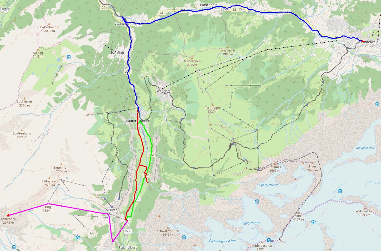 57.0 km, davon 7,38 km gewandert (die Zahlen sind aber wirklich nur ganz vorsichtige Schätzungen und enthalten massive Messfehler, außerdem fehlt die gesamte Strecke innerhalb der Trümmelbachfälle, da kann man nochmal einen Kilometer gedanklich dazurechnen)