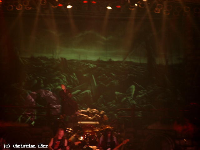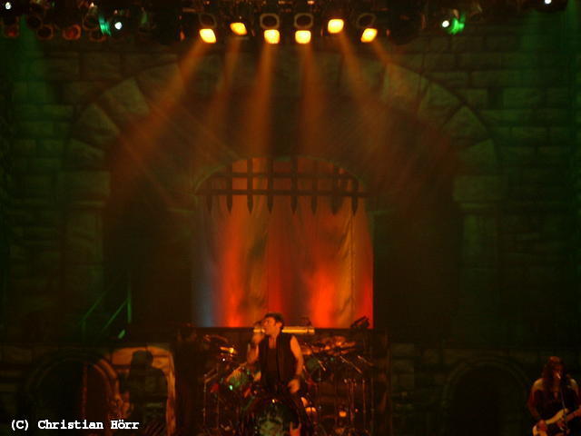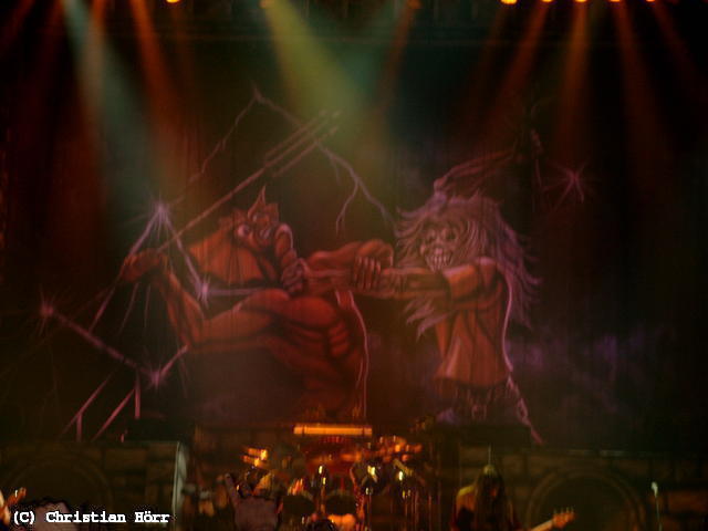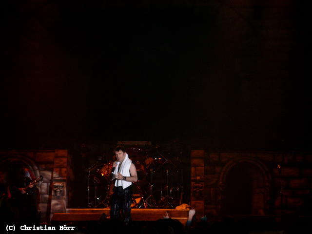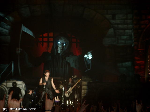 FotoFotoBeim folgenden Dance Of Death (also dem Song, Tote tanzten nicht) trug Bruce dann plötzlich eine Maske wie die Figuren auf dem Cover des Albums (der zugehörige Backdrop war übrigens eine gezeichnete Version eben dieses Covers – warum sie nicht einfach die computergenerierten Figuren aus dem Albumcover genommen haben, ist mir nicht ganz klar) Bruce sprang jedenfalls wie ein Derwisch mit Maske und Umhang über die Bühne und hatte dabei was von Mephisto aus Goethe’s Faust. Danach gabs zur Erholung erst mal die leichtverdauliche zweite Single des Albums, Rainmaker. Im Gegensatz zum Album zündeten die Songs live wesentlich besser, weil der schlechte Mix nicht störte.