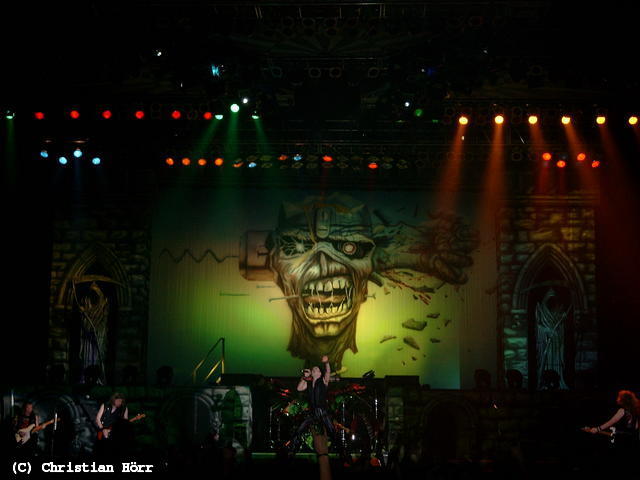 FotoFotoDer Stacheldraht wurde wieder abgebaut, und dann folgte mit Lord Of The Flies ein kurzer Ausflug in die Blaze-Bayley-Ära. Ich muß zu meiner Schande gestehen, daß ich zuerst Schwierigkeiten hatte, den Song zu erkennen, aber dann entpuppte sich diese Live-Version als allererste Sahne, insbesondere die doch recht andere Stimme von Bruce (der zudem in Topform war) veränderte den Charakter des Songs gehörig. Dieser Sänger ist ein absolutes Phänomen, wie er es schafft, wie von der Tarantel gestochen kreuz und quer über die Bühne zu sprinten, zu springen und auf den Aufbauten herumzuklettern, und gleichzeitig noch so zu singen, ist mir teilweise ein echtes Rätsel. Der Rest der Band steht dem aber in nichts nach, Bassist Steve Harris und Gitarrist Janick Gers waren ebenfalls omnipräsent an allen Ecken und Enden der Bühne. Ganz im Gegensatz zu den beiden anderen Gitarristen Dave Murray und besonders Adrian Smith, der seine Soli völlig lässig und betont cool aus dem Handgelenk schüttelte.