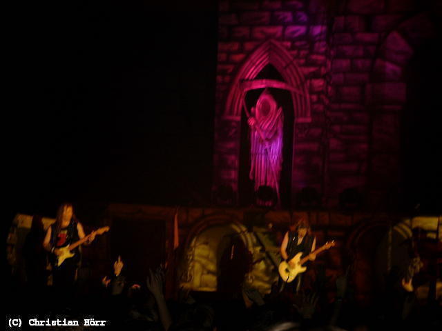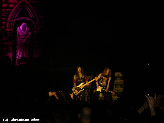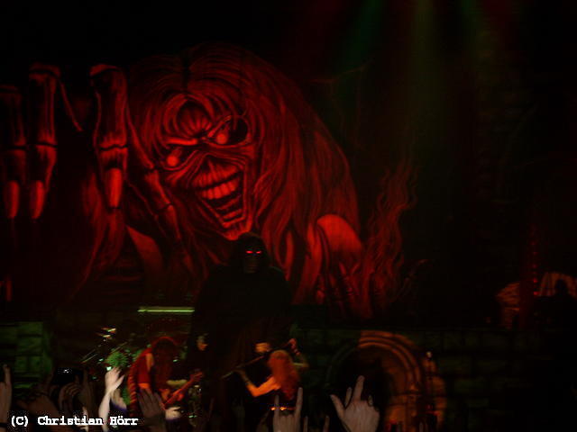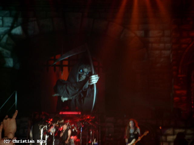 FotoFotoDas große Finale leitete dann No More Lies ein, zu dem man sehr schön herumbrüllen kann, was wir uns natürlich nicht nehmen ließen. Spätestens bei den folgenden Songs Hallowed Be Thy Name und Fear Of The Dark brachen dann endgültig alle Dämme, es wurde gebangt, die Fäuste in die Luft geschwungen und lauthals mitgesungen, daß es nur so eine Freude war. Der chö haute mir seine Haare mehr als einmal in den Rücken und ging gerade bei den Soli voll ab. Leider war mit dem folgenden Iron Maiden das Konzert fast schon wieder vorbei. Aber vorher zog die Band mit einem riesigen Eddie-Grim Reaper nochmal alle Register.