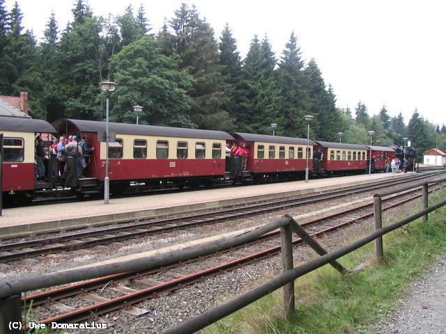 Wir wollten ja in Schierke aussteigen und den Brocken zu Fuß erklimmen, allein schon weil man da mal eben 15 EUR Fahrpreis sparen kann. Wie wir also bei der Einfahrt in den Bahnhof aufstanden, guckten uns die Leute aus dem Waggon an wie die ersten Autos oder als wären wir Außerirdische. Offenbar war nicht bekannt, daß man aus dem Zug auch schon vor dem Brocken aussteigen konnte. Tja, wir machten uns dann jedenfalls auf den Fußmarsch und lachten über die Menschenmassen, die den Zug zur Sardinendose werden ließen, denn in Schierke stiegen noch einmal jede Menge Leute zu.