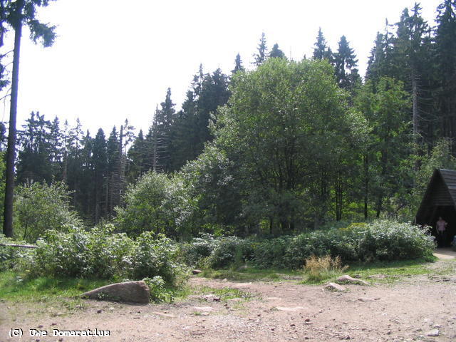 Und so waren wir dann gegen 13:45 Uhr auf dem Gipfel – und mit uns noch jede Menge mehr oder weniger lauffauler Leute. Es ist in der Tat erschreckend zu sehen, wie viele übergewichtige Menschen sich mit dem Zug auf den Gipfel chauffieren lassen und sich nur die letzten Meter nach oben walzen und nach Luft japsen, bevor sie mit dem nächsten Zug wieder zurückfahren. Unsereins zählt nicht zu dieser Spezies und wandert darum nicht nur hoch, sondern auch wieder runter. Aufgrund einer zeitlichen Fehlplanung hatten wir nun jedoch das Problem, den Zug von Schierke zurück nach Wernigerode möglicherweise knapp zu verpassen. Also lautete der Beschluß, daß man schneller marschieren muß.