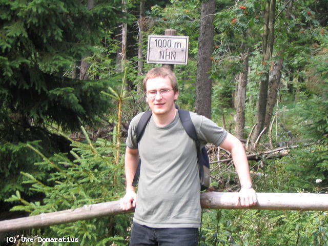 Nach einer weiteren Pause vor den Eckerlöchern ging es nun daran, ein paar Höhenmeter zu erklimmen. Der Aufstieg dort ist vergleichsweise anstrengend, außerdem bin ich ja total aus der Übung, so daß der Puls dann doch in ungewohnte Höhen stieg, aber wir stiegen ja auch in ungewohnte Höhen, insofern paßte das dann wieder. Ein Foto an der 1000m-Marke und noch ein paar Treppen und Steinstufen später kamen wir dann an der asphaltierten Brockenstraße raus. Dort wurde nochmal pausiert, bevor das letzte Stück in Angriff genommen wurde.