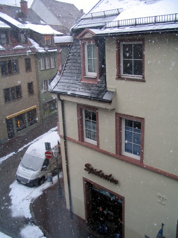 Was sieht man da so? Das Dach vom gegenüberliegenden Haus. Die Einmündung der Gasse zur Straße. Ein Einfahrt verboten-Schild. Den Eingang zum Spielsalon gegenüber. Das Schaufenster des Sehrgemischtwarenladens auf der anderen Straßenseite. Das Schaufenster des Modellbahnhändlers daneben. Was sieht man noch? Ganz wunderbar super hervorragendes Frühlingswetter sieht man (je nach Definition von wunderbar gut hervorragendem Frühlingswetter, versteht sich). Gut, das Thermometer sieht man nicht, das hängt im anderen Fenster und zeigt irgendwas um null Grad an.