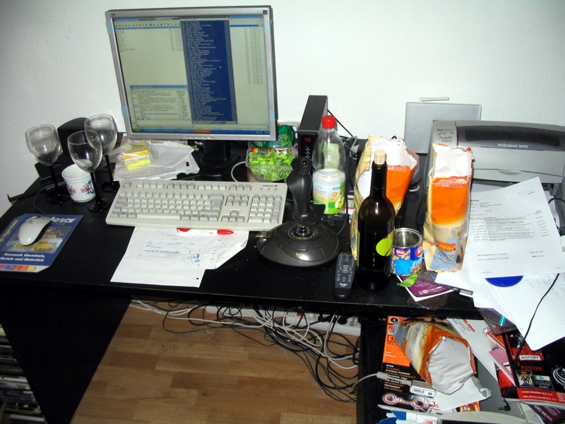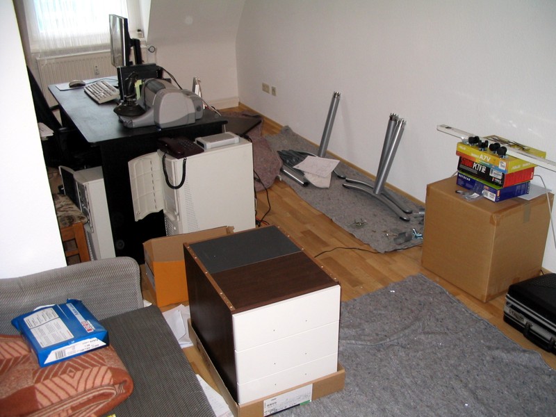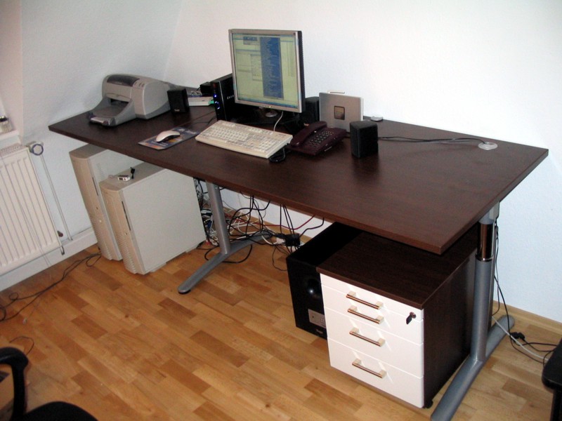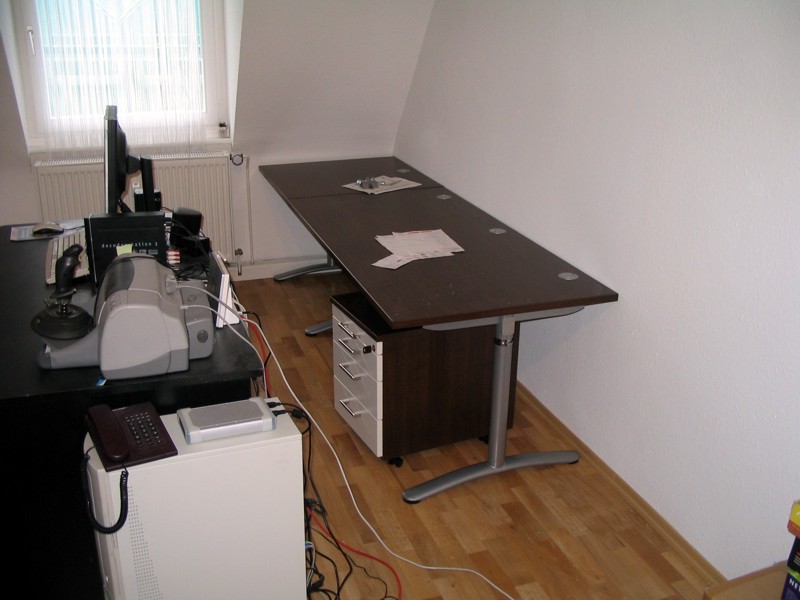 ..dauert ein Fußballspiel. 90 Minuten dauerte meine Wartezeit heute, bis die Möbelleute kamen. 90 Minuten dauerte es, bis ich meine Rechner und sonstige Kabel wieder korrekt entwirrt und eingestöpselt hatte. Aber der Reihe nach: Wie dem ein oder anderen aufgefallen sein dürfte, wohne ich jetzt seit über einem Jahr in meiner derzeitigen Wohnung, allerdings fehlte dieser bislang so ziemlich jegliches Mobiliar. Da dies kein Dauerzustand sein kann war vor Ostern Großeinkauf angesagt, und heute kam nun die erste daraus resultierende Lieferung: ein Schreibtisch samt Rollcontainer und ein Läufer. Die ersten beiden Dinge wurden aufgebaut, das letzte zumindest ausgepackt. Das war gegen Mittag. Heute abend musste ich dann erstmal den Schreibtisch auf eine für mich brauchbare Höhe justieren (jetzt kann er wieder zwei cm tiefer…), ein Unterfangen, was alleine leider nicht wirklich einfach war. Der anstrengendere Teil war dann das Entwirren von schätzungsweise vierunddreißig Millionen Kabeln (Strom, Eingabegeräte, Ausgabegeräte, Beschallung, Netzwerk, …) und das korrekte Wiedereinstöpseln derselben. Dafür hab ich nun einen schön großen Arbeitsplatz 🙂