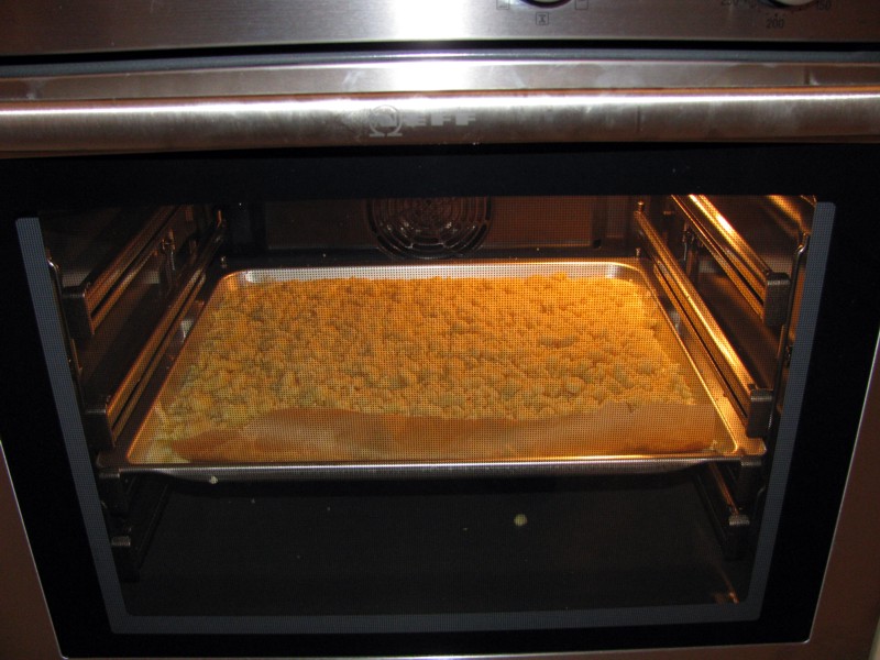 Jetzt kommen noch die Streusel drauf. Dafür braucht man 400g Mehl, 250g Zucker, 300g Butter und eine Packung Vanillezucker. Das verknetet man alles, bis eine bröselige Masse entsteht. Die verstreuselt man dann auf dem Blech. Das Blech mitsamt darauf befindlicher Kuchenrohmasse kommt dann in den Ofen und wird bei ungefähr 175 Grad so lange durchgewärmt, bis die Streusel nicht mehr aussehen wie vom Blitz erschreckt.