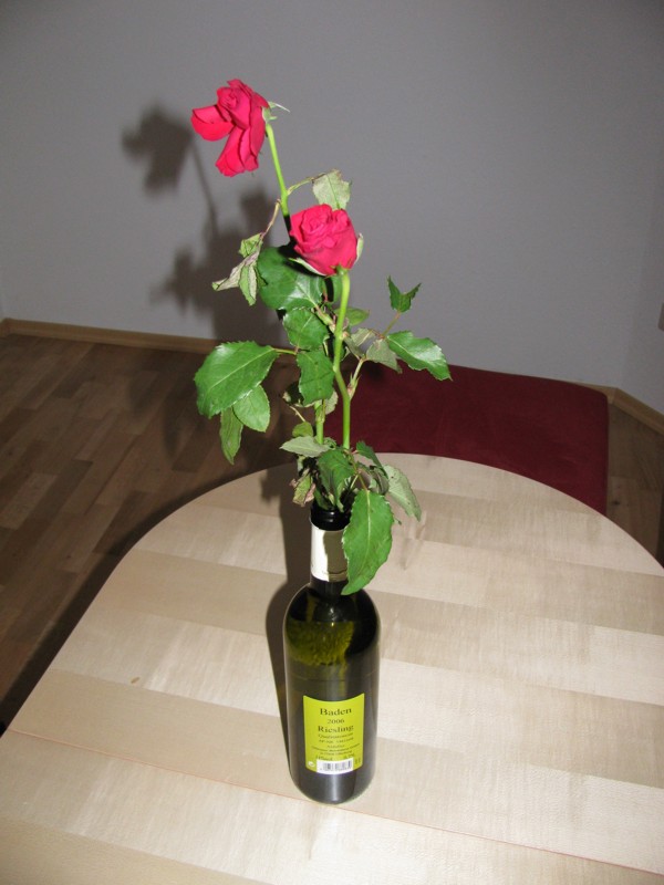 Das im Bild zu sehende Ensemble verdanke ich meiner Mutter sowie meiner Tante, die beide gestern mit je einer Möchtegern-Rose bewaffnet bei mir aufschlugen (irgendwo vorm Supermarkt in die Hand gedrückt bekommen, soweit ichs verstanden habe). Da ich in meiner Junggesellenbude keine Blumenvasen habe (wozu auch, mir schenkt ja keiner welche und ich will auch gar keine haben), musste die zum Glück im Lauf der letzten Woche geleerte Weinflasche als Ersatz herhalten. Die Blumen selbst sind ein schlechter Witz, immerhin nicht aus echt Plastik, aber ungefähr genauso duftneutral. Eben aus der Kategorie „geschenkt ist noch zu teuer“.