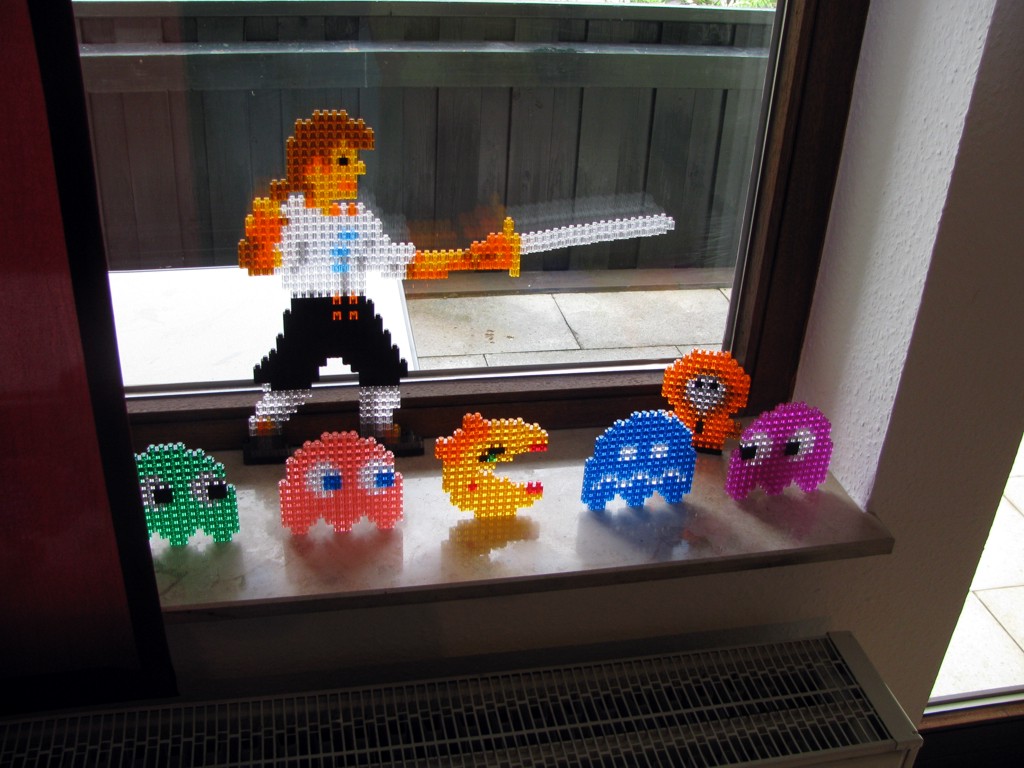 Es wurde gefeiert und viel Blödsinn gelabert, die Bowle wurde alle, der Kuchen nicht, das Abendessen fast. Darüber hinaus bleibt festzuhalten, dass Gott am Anfang Kaffee und Kuchen erschuf und dem blacky eine Gabel reichte. Außerdem ist es immer gut, Nerds einzuladen, denn die bewundern als allererstes mal den Guybrush auf dem Fensterbrett, diskutieren dann über das Rouge von Ms PacMan (99% der anderen hauptsächlich sinnfreien Diskussionsbeiträge hab ich schon wieder vergessen, das Alter, Gedächtnis => Sieb und so…) und erweitern das Ensemble schließlich um Kenny (aus South Park) und eine Rose (damit dann wenigstens eine Blume aus echt Plastik im Fenster steht) – nächstes Jahr gibts dann mehr Steine. Ebenfalls gut ist es, wenn die Gäste einen erlesenen Musikgeschmack haben und man dann prima mit DVDs von Pink Floyd, Led Zeppelin und Queen im Hintergrund unterhalten kann. Was war noch? Vier Anrufe, davon dreimal die Frage, wo zum Henker denn der Hauseingang zu finden ist… Ein paar Fotos gibts auch noch…