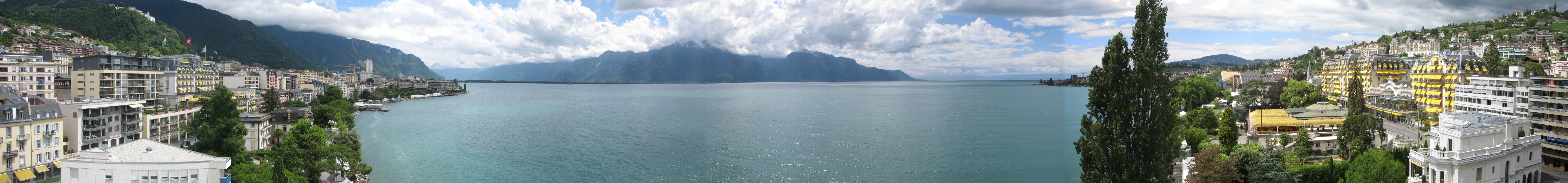 Das Hotel selbst liegt direkt an der Uferpromenade, von meinem Zimmer im siebten Stock hatte ich einen irren Panoramablick von über 180 Grad (das Hotel hat einen dreieckigen Grundriss mit Spitze zum Seeufer). Ich sah also panoramamäßig hellgraue, dunkelgraue, mausgraue und noch ein paar mehr Grautöne. In Richtung Westen wurde es aber heller, es dauerte allerdings noch bis weit nach 16 Uhr, dass der Regen aufgehört hatte.