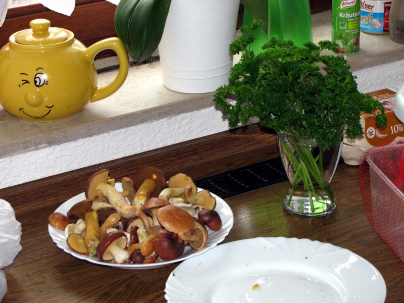Der WBahn und Naturschutzetterbericht verhieß wenig Gutes, also wurde spontan beschlossen, nicht in der Fränkischen Schweiz herumzutrampeln, sondern nur wilde Hottehüs im Forst anzuschauen. Dieser Plan wurde dann auch umgehend in die Tat umgesetzt, so dass wir gemütlich rund 8 km im Wald herumliefen. Nach den ersten 3 km wurde meiner Mutter das Herumlaufen und Pflanzenbestimmen („Guck mal hier, Pfaffenhütchen„) zu langweilig, weswegen sie umgehend ihrer Sammelleidenschaft fröhnte („Och gucke mal da, Butterpilze„). Gut, wir wanderten zwar im Naturschutzgebiet, aber wenn einem die Pilze quasi schon vom Weg in die Tasche hüpfen… Das Wandertraining war damit jedenfalls beim Teufel, dafür trainierten zumindest meine Eltern die Bauchmuskulatur beim Bücken und Pilze angucken. Ich sammle ja eher andere Dinge als Pilze, von daher war mir das dann auch alles reichlich egal. Immerhin hielt das Wetter, es nieselte nur mal zwischendrin ein wenig, und pünktlich zum Kaffeetrinken waren wir wieder daheim.