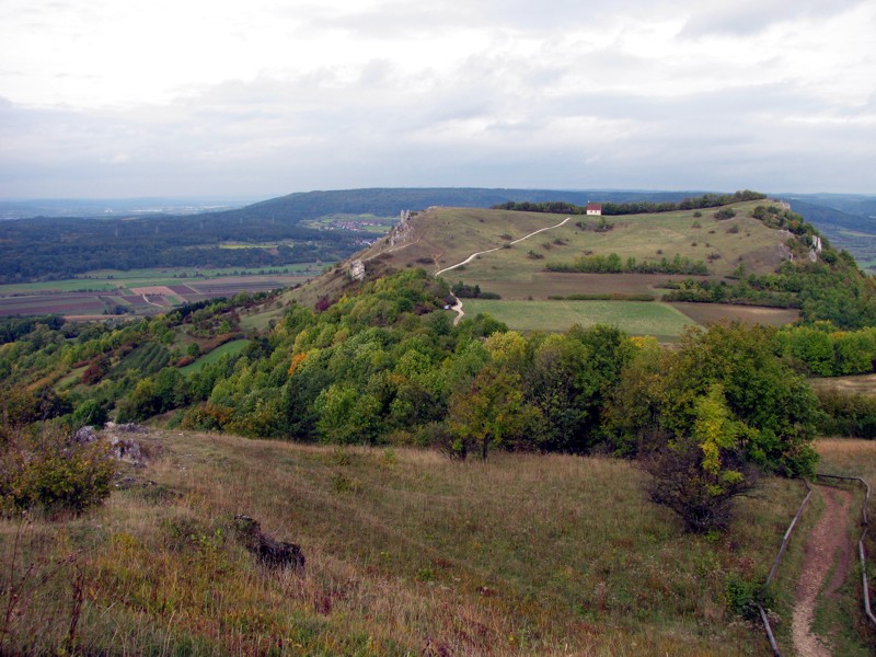 Das Wetter sah deutlich besser aus, weswegen nun die Wanderung in der Fränkischen Schweiz durchgezogen wurde. Dabei ging es einmal rund ums Walberla (und natürlich den Berg rauf, wenn man schon mal ’nen Berg vor sich hat). Hier gabs keine Pilze, sondern nur Walnüsse, gackernde Weihnachtsbraten in spe, einen öchzig Jahre alten Porsche-Traktor und einen Feuersalamander (live und in Farbe). Außerdem stellte ich fest, dass ich die falschen Schuhe trug, durch den Regen vom Vortag wars doch stellenweise schön rutschig. Dafür gabs dann oben auf dem Berg Aussicht in verschiedene Richtungen. Die Runde war jedoch etwas kürzer als gedacht, weswegen wir doch recht pünktlich wieder in Erlangen landeten. Während der Rückfahrt riß sogar der Himmel auf, getreu dem Motto „Über Franken lacht die Sonne, über Bayern die ganze Welt“.