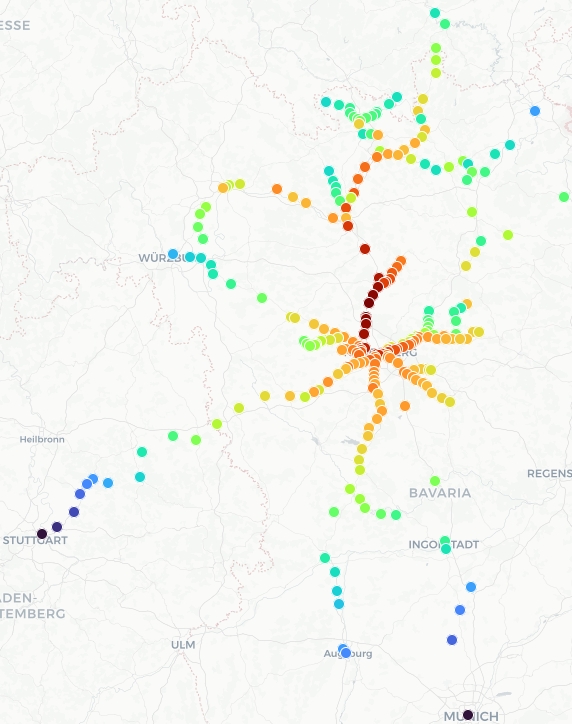 Das sieht dann so aus. Das rot-orangene Zentrum ist Nürnberg, von dort aus führen die Strecken sternförmig in alle Himmelsrichtungen. Bamberg wäre ein nahegelegenes Ziel, Würzburg ist im Westen erreichbar, Stuttgart liegt grade noch so innerhalb des Zeitlimits. Im Süden sind Augsburg und München die Grenze (wobei ich da definitiv immer die direkte ICE-Verbingung nehmen würde und in ungefähr einer Stunde in München wär statt in drei Stunden). Ganz im Norden ist in Saalfeld Schluss, im Nordosten markiert Hof einen letzten blauen Punkt. Problem an der schicken Auflistung: Die meisten Ziele kenne ich entweder schon oder sie interessieren mich schlicht nicht 🙂
