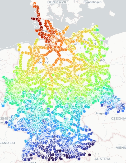Ich kann also aus berufenem Munde behaupten, dass Sylt als Ziel völlig überbewertet wird. Schon von Hamburg aus dauert es über drei Stunden um anzukommen, und da man mit dem Neun-Euro-Ticket keinen Fernverkehr nutzen kann, wirds noch länger dauern. Da ich aber vor einigen Jahren schon mal auf eine Anfrage eines Studienkumpels ausgerechnet hatte, welche Ziele er in 10h mit dem Zug errreichen könnte (siehe hier), wollte ich jetzt mal ausrechnen, wann man von wo losfahren muss, um pünktlich beim Dosenbierweitwurf teilnehmen zu können.