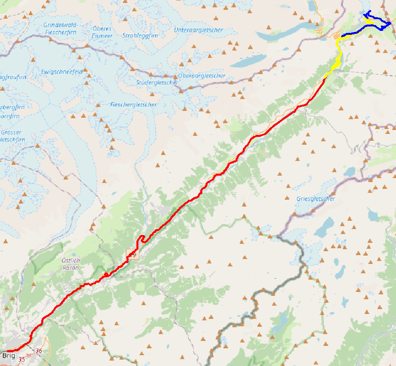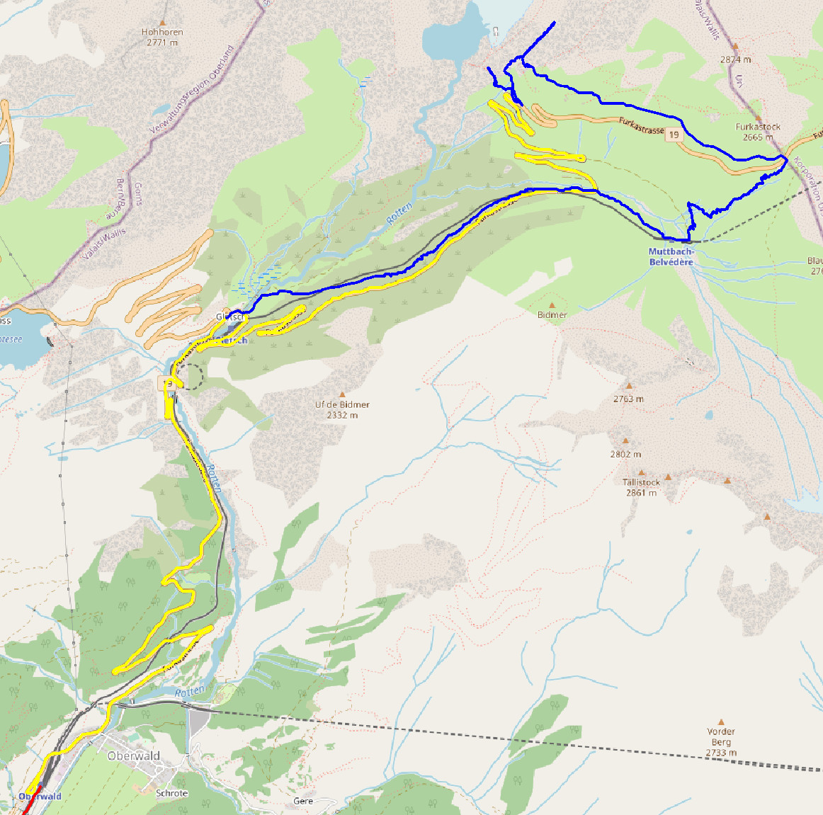 Von Belvedere Furka mit Umweg über den Rhonegletscherblick bzw. die Eisgrotte zum Furkapass, von dort über die Bahnstation Muttbach nach Gletsch. Der Plan sah außerdem noch vor, von Gletsch hinunter nach Oberwald weiter zu wandern, aufgrund des Wetters und der Uhrzeit entfiel das.